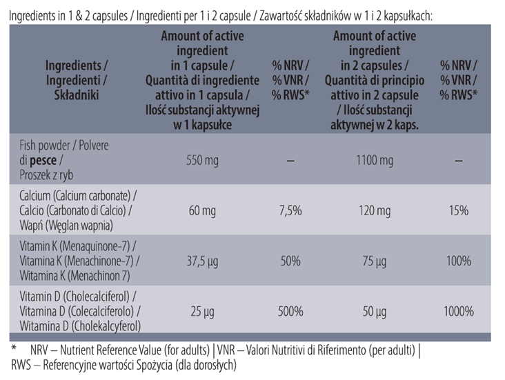 The product is intended for adults who want to supplement their diet with nutrients naturally present in fish, as well as vitamins and minerals supporting proper bone health.